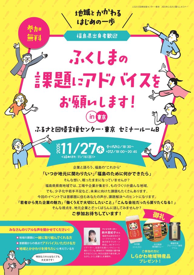 定員 | 15名 (参加者には、しらかわ地域の特産品をプレゼント) |