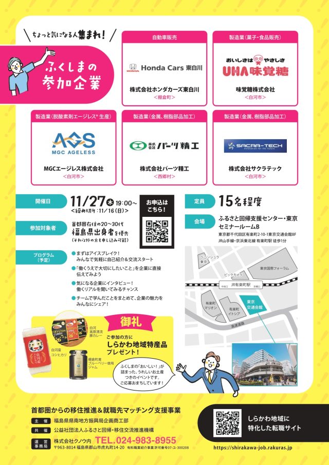 当日は、福島県県南地域の企業と一緒にお仕事のこと、暮らしのこと、プライベートなこともざっくばらんにお話できます。