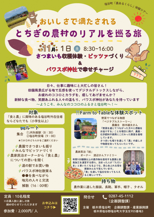 プログラム内容★さつまいも掘り 「ベジタブルストーリー」鈴木雄太さんの農園 ★みんなでピッツァづくり 「農家民泊 『結』」さん ★パワースポット神社で地元の人々と交流 「岩戸別神社」 注意事項■小雨天決行となりますが、悪天の場合には中止となります。