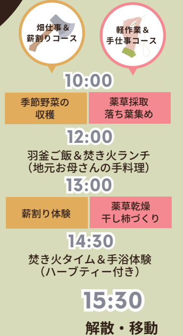 ① 畑しごと&薪割りコース:体を動かして里山の基礎しごとを体験。