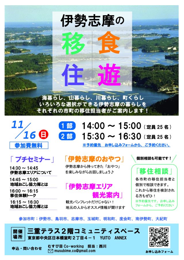 プチセミナー、移住相談、観光案内など伊勢志摩のおやつを食べながら気軽に参加できる移住フェアです!