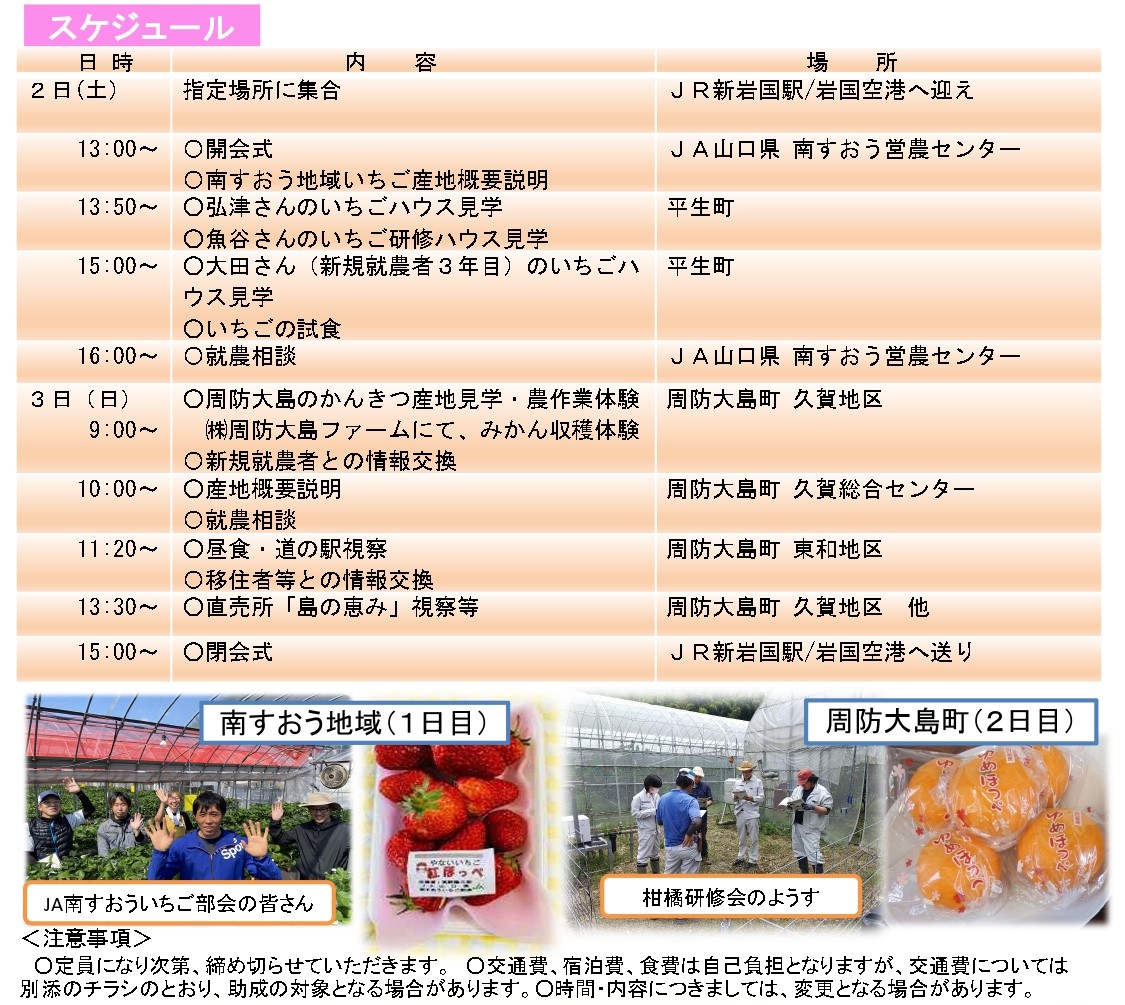 山口県では、山口県周防大島・南すおう地域の農業産地の現地見学並びに農作業体験、先輩就農者や市担当者等との懇談・相談等を開催します。