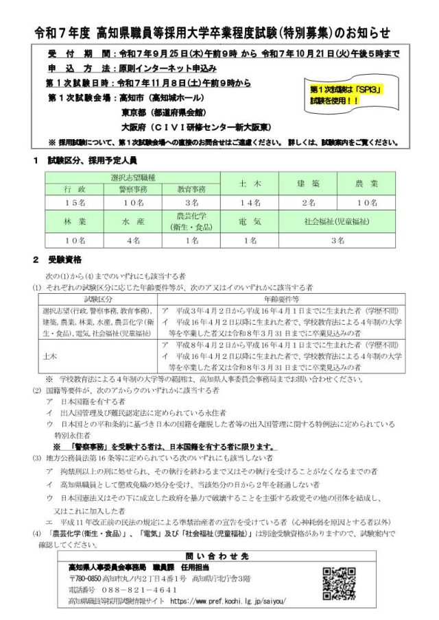 \ 高知県では大学卒業程度試験(特別募集)の申込を受付中です(申込R7.10.21まで)/