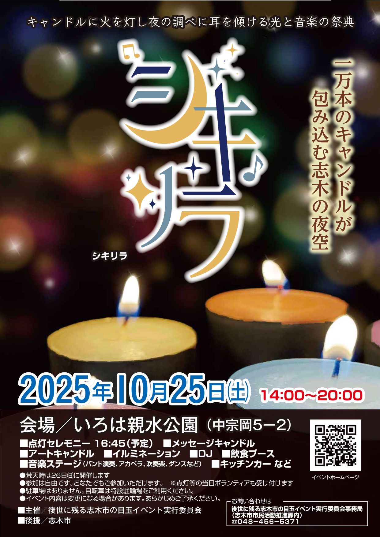 投稿日:2025.10.10 最終更新日:2025.10.10 埼玉県 交流・体験地方都市 後世に残る志木市の目玉イベント「シキリラ」 光と音楽のイベント「シキリラ」 後世に残る志木市の新たな目玉となるイベントシキリラは、いろは親水公園を舞台に、参加者が、それぞれの願いや思いを込めたキャンドルに火を灯し、夜の調べに耳を傾ける光と音楽のイベントです。 内容としては、昼の部は市内中学生の吹奏楽やキッズダンスステージ、キャンドルの設置など子どもから大人までが楽しめる参加型イベント、夜の部ではキャンドルやイルミネーションにあかりが灯り、地域の大学生やプロアーティストによるアコースティックライブを聴きながら幻想的な雰囲気を感じられるイベントとなっています。 詳しく見る この記事をシェアする Twitter Facebook LINE pocket Linked in はてな
