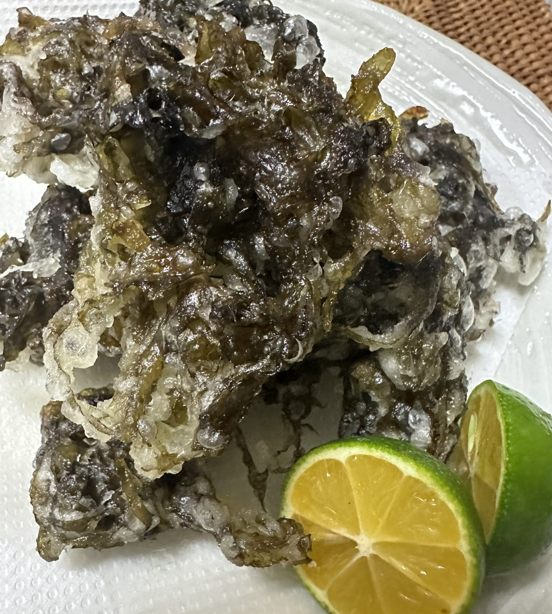 写真(左)の上左にある「三宅島産はばのり」をのり100%のてんぷらにしてみました。サックサクではばのりの香りが美味でした。海水温の上昇などで年々少なくなってきてる希少品なのりです。