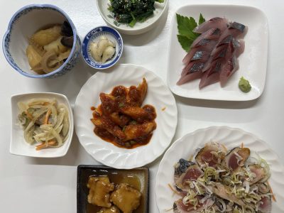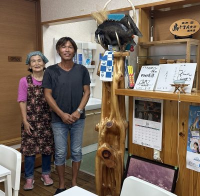 💛お世話になった宿泊先のオーナー武藤剛さんと三宅島出身のお母さま。調理師のご主人と内地で中華料理店を経営されていた時2000年の大噴火が起こり、復興作業のために島へ残った方への応援としてもともとあったご自身の店舗で食事を提供したことがきっかけで帰島されたとのこと。オーナーの剛さんは宿の経営、調理師、漁師と早朝より漁に出て獲った魚を調理する。島の魚を熟知した漁師さんならではの珍しいお魚を調理してくださいました。なめもんがら、つむぶり、おじさん、ツノザメなどなど。中でもツノザメは絶品でした!