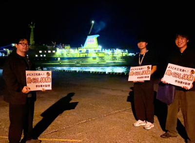10月中旬の朝5時。到着港は錆が浜。日中の気温は25度くらいですが、朝晩はひんやり。役場職員の木村さん(左)、富重さん(中)、地域おこし協力隊の沖山さん(右)が参加者を出迎えます。