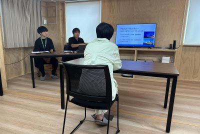 🏝交流棟でオリエンテーション。すでに顔見知りですが(^^;参加者とスタッフの自己紹介、三宅村について学びます。